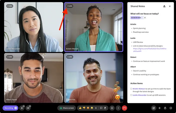 also see talk-time percentages to see how much each person in the meeting is talking.